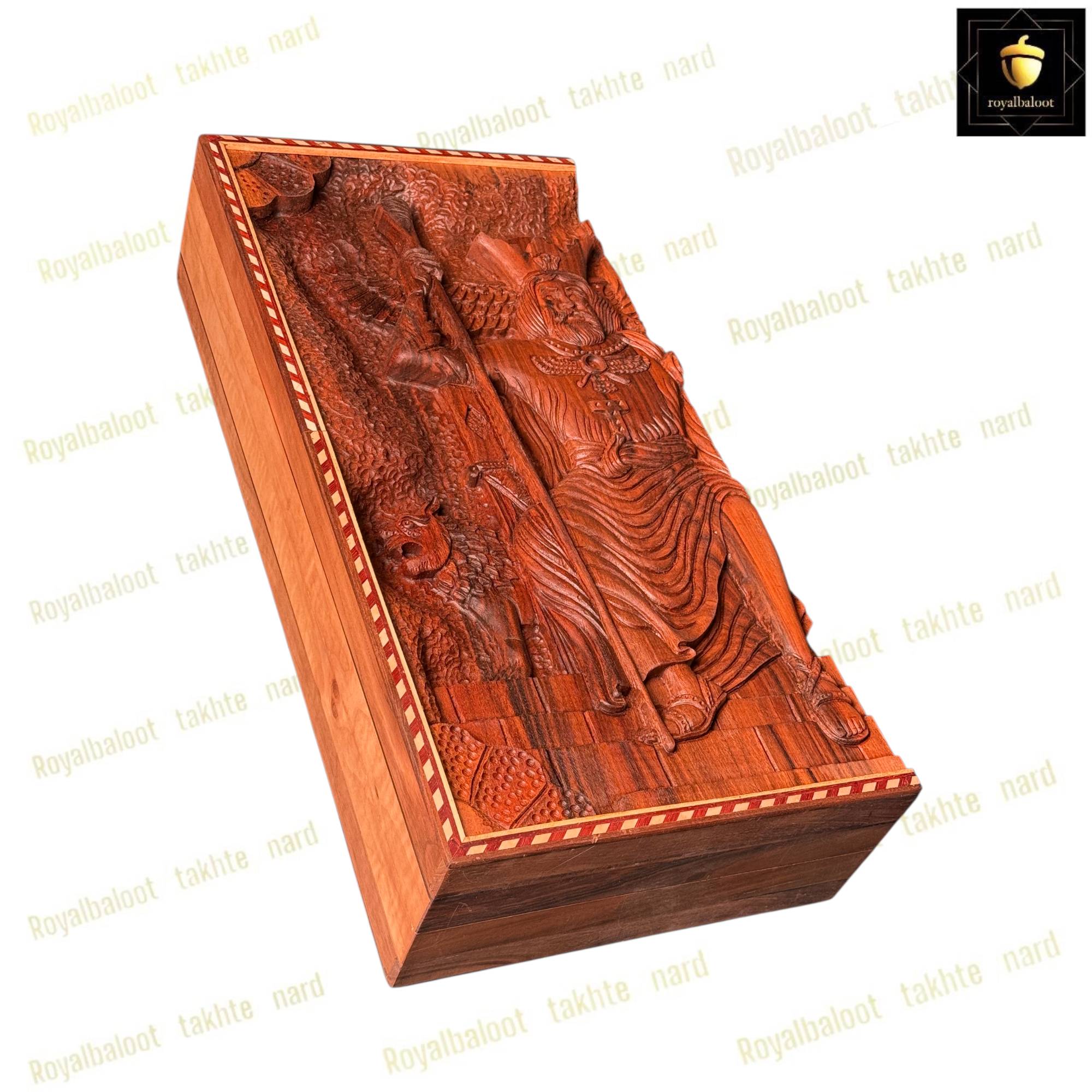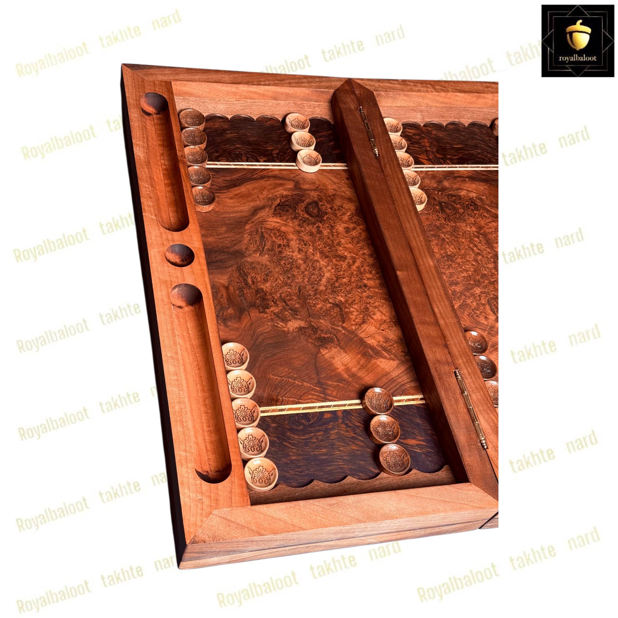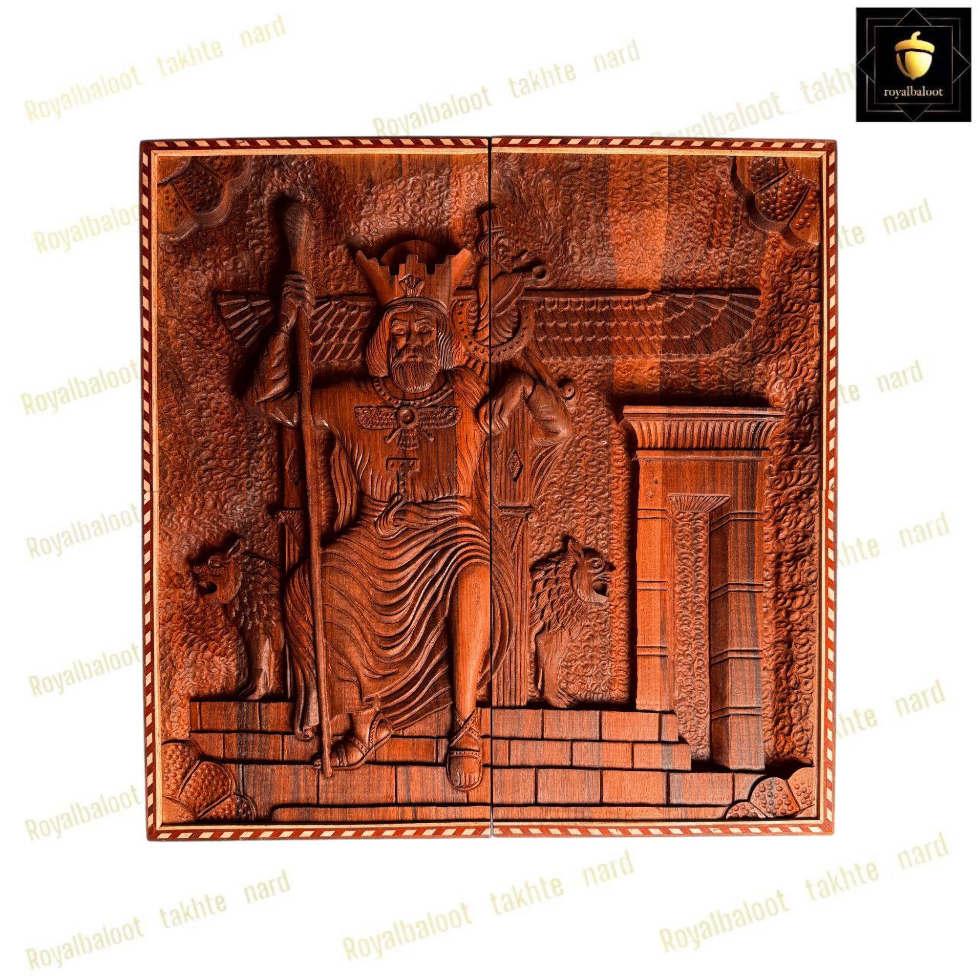تخته نرد از چوب گردو ساخته شده سایز تخته نرد 60*60 میباشد به صورت تک بازی تخته نرد میباشد پشت تخته نرد کامل منبت میباشد کار دست و بسیار پرکار و با عمق بالا منبت شده داخل تخته نرد ریشه گردو میباشد کنار تخته نرد جای مهره کار شده شانه های تخته نرد از چوب گردو ساخته شده منبت تخته نرد طرح داریوش . تخت پادشاهی داریوش . فروهر بسیار پرکار و عمیق میباشد دو عدد لولا قوی مخفی برای تخته نرد طراحی شده موجب راحت باز و بسته کردن تخته نرد میشود تخته نرد همراه مهره تخته نرد چوب گردو زیر پارچه تاس المانی سنگین وزن دار تاس مالزی چرخش بالا و کاور میباشد داخل تخته نرد ریشه گردو میباشد بسیار زیبا و پر از نقش ها و گره های طبیعی چوب میباشد بهترین چوب برای ساخت تخته نرد چوب گردو میباشد دوام و ارزش بسیار بالایی دارد بهترین انتخاب برای تخته نرد بازان و افراد حرفه ای چوب گردو میباشد در صفحه منبت این تخته نرد داریوش بزرگ بر تخت پادشاهی نشسته و با وقاری سلطنتی بر تخت پادشاهی نشسته و با وقاری سلطنتی به تصویر کشیده شده است . در پس زمینه نماد فروهر با ظرافتی چشمگیر حک شده در پس زمینه نماد فروهر با ظرافتی چشمگیر حک شده و در کنار ان بخش هایی از معماری باشکوه تخت جمشید دیده میشود ترکیب این عناصر صحنه ای باشکوه و الهام گرفته از دوران زرین هخامنشی را شکل داده صحنه ای که عظمت قدرت و اصالت تاریخ ایران را در قالب منبت کاری ظریف و دقیق به نمایش میگذارد داخل تخته از چوب گردو به صورت قرینه با بافت طبیعی و نقش های چشم نواز ساخته شده شانه ها به صورت شیب طراحی شده تا تاس روی ان نایستد و بازی به صورت روان ادامه پیدا کند و دارای جای مخصوص برای قرار دادن مهره ها و تاس است تا از گم شدن ان ها جلوگیری شود دسترسی به مهره ها اسان تر باشد این محصول از چوب گردو ساخته شده و دارای دو لولا المانی درجه یک و مخفی است که باز و بسته شدن ان را روان و بی صدا میکند تخته نرد با روغن هاردواکس پوشش داده شده تا زیبایی طبیعی چوب حفظ شده و دوام تخته افزایش یابد