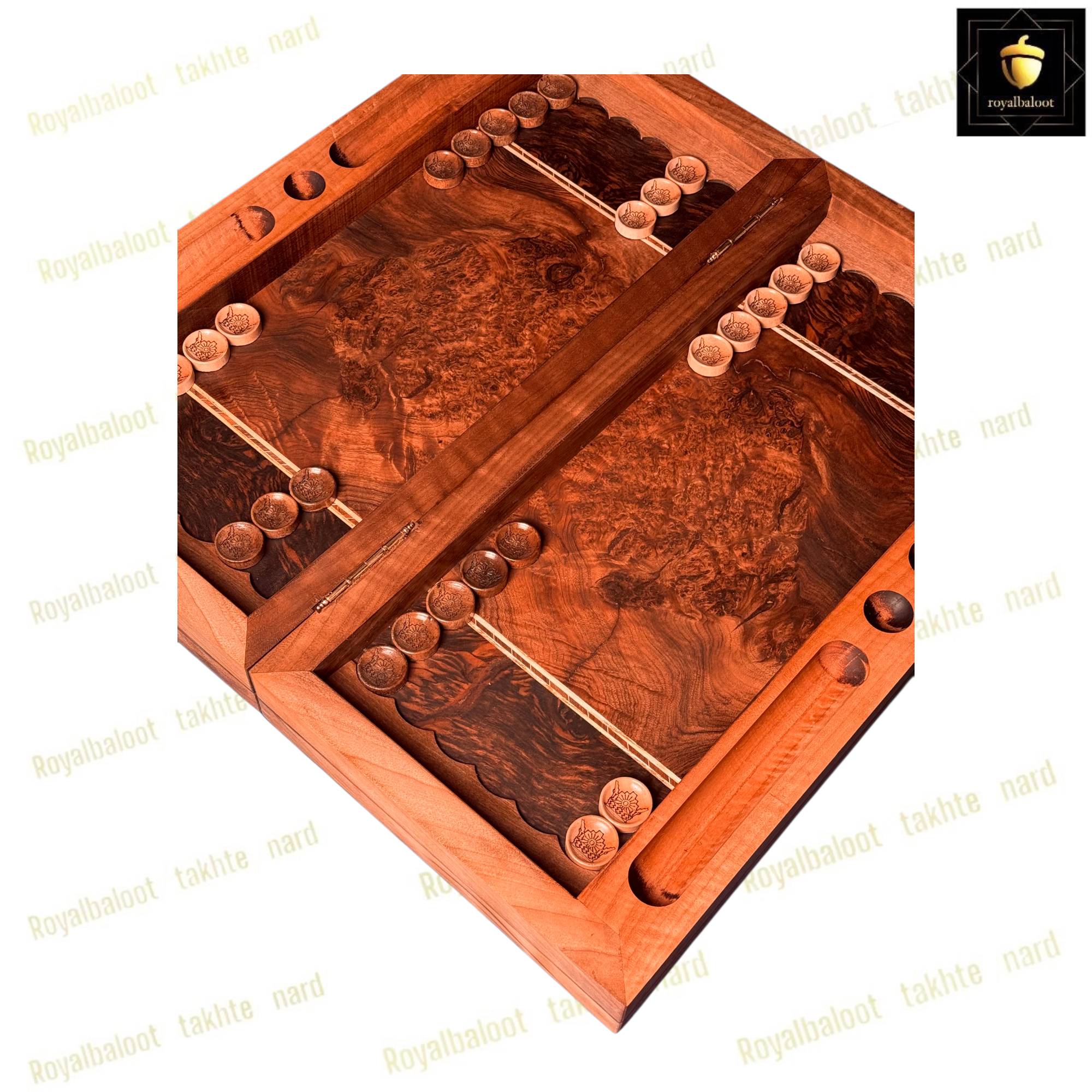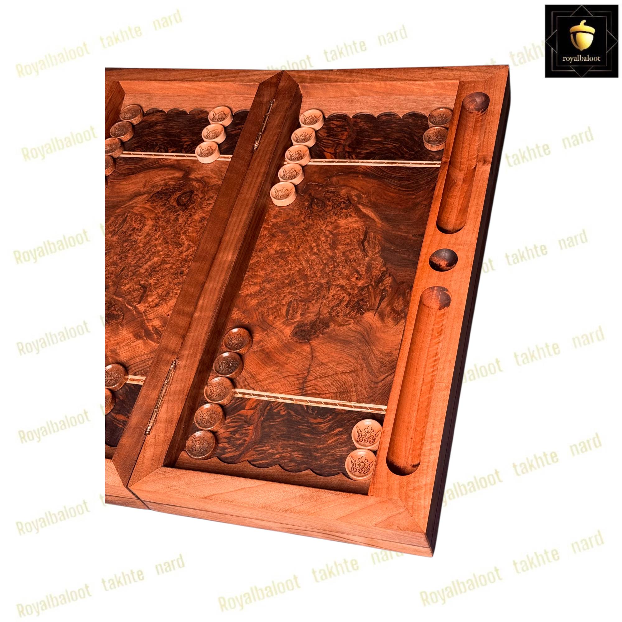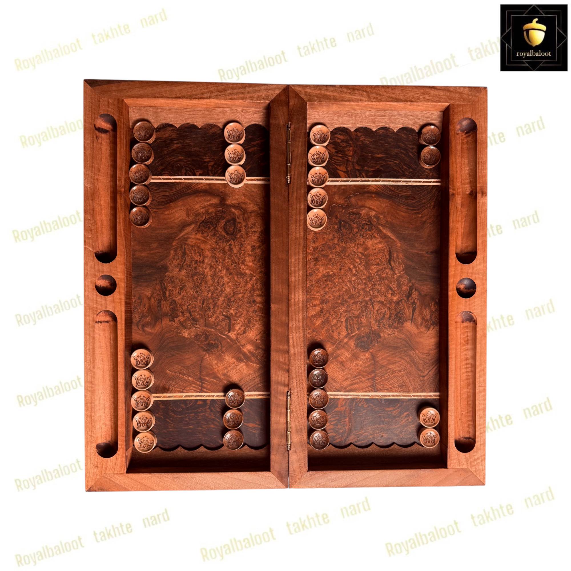 تخته نرد از چوب گردو ساخته شده سایز تخته نرد 60*60 میباشد به صورت تک بازی تخته نرد میباشد پشت تخته نرد کامل منبت میباشد کار دست و بسیار پرکار و با عمق بالا منبت شده داخل تخته نرد ریشه گردو میباشد کنار تخته نرد جای مهره کار شده شانه های تخته نرد از چوب گردو ساخته شده منبت تخته نرد طرح داریوش . تخت پادشاهی داریوش . فروهر بسیار پرکار و عمیق میباشد دو عدد لولا قوی مخفی برای تخته نرد طراحی شده موجب راحت باز و بسته کردن تخته نرد میشود تخته نرد همراه مهره تخته نرد چوب گردو زیر پارچه تاس المانی سنگین وزن دار تاس مالزی چرخش بالا و کاور میباشد داخل تخته نرد ریشه گردو میباشد بسیار زیبا و پر از نقش ها و گره های طبیعی چوب میباشد بهترین چوب برای ساخت تخته نرد چوب گردو میباشد دوام و ارزش بسیار بالایی دارد بهترین انتخاب برای تخته نرد بازان و افراد حرفه ای چوب گردو میباشد در صفحه منبت این تخته نرد داریوش بزرگ بر تخت پادشاهی نشسته و با وقاری سلطنتی بر تخت پادشاهی نشسته و با وقاری سلطنتی به تصویر کشیده شده است . در پس زمینه نماد فروهر با ظرافتی چشمگیر حک شده در پس زمینه نماد فروهر با ظرافتی چشمگیر حک شده و در کنار ان بخش هایی از معماری باشکوه تخت جمشید دیده میشود ترکیب این عناصر صحنه ای باشکوه و الهام گرفته از دوران زرین هخامنشی را شکل داده صحنه ای که عظمت قدرت و اصالت تاریخ ایران را در قالب منبت کاری ظریف و دقیق به نمایش میگذارد داخل تخته از چوب گردو به صورت قرینه با بافت طبیعی و نقش های چشم نواز ساخته شده شانه ها به صورت شیب طراحی شده تا تاس روی ان نایستد و بازی به صورت روان ادامه پیدا کند و دارای جای مخصوص برای قرار دادن مهره ها و تاس است تا از گم شدن ان ها جلوگیری شود دسترسی به مهره ها اسان تر باشد این محصول از چوب گردو ساخته شده و دارای دو لولا المانی درجه یک و مخفی است که باز و بسته شدن ان را روان و بی صدا میکند تخته نرد با روغن هاردواکس پوشش داده شده تا زیبایی طبیعی چوب حفظ شده و دوام تخته افزایش یابد