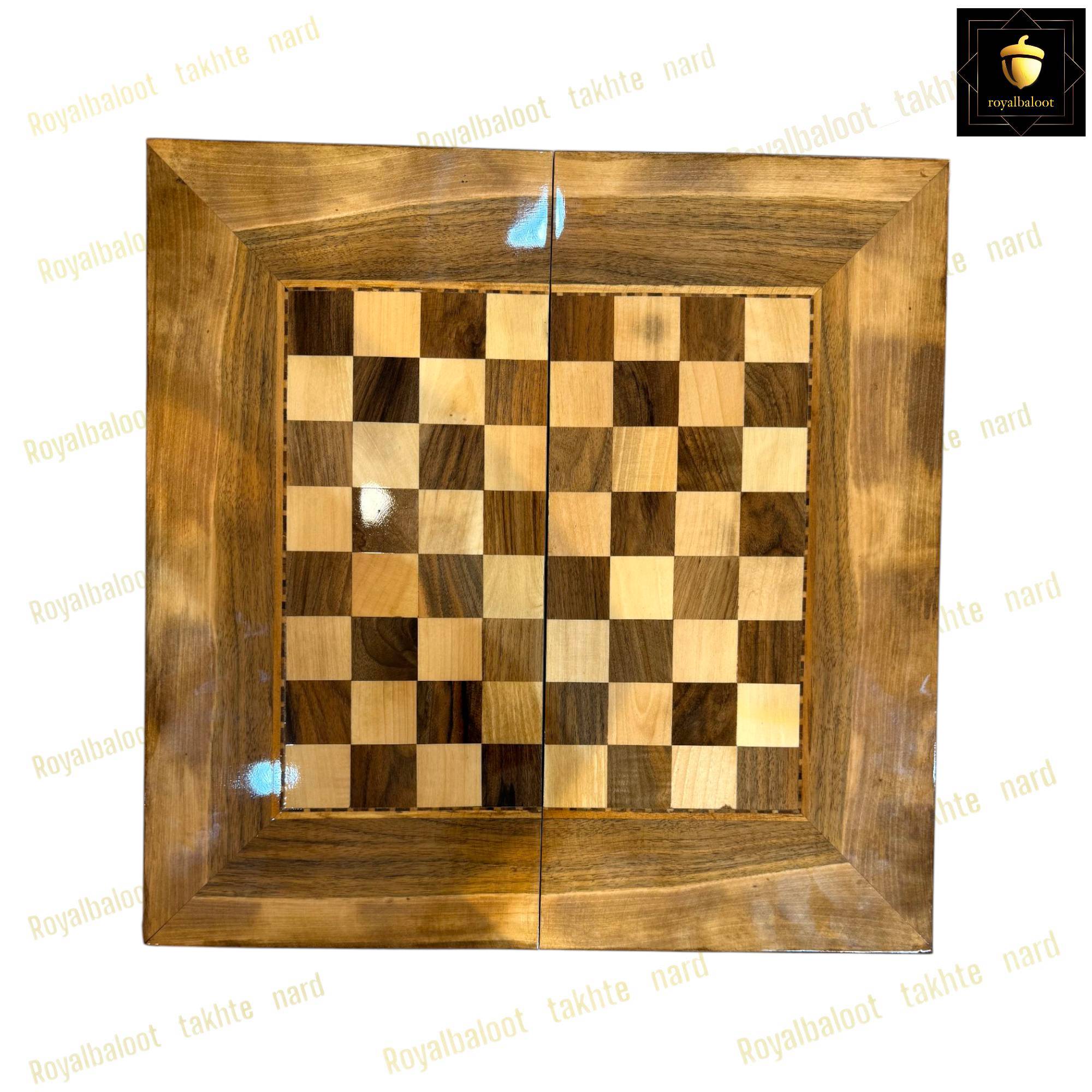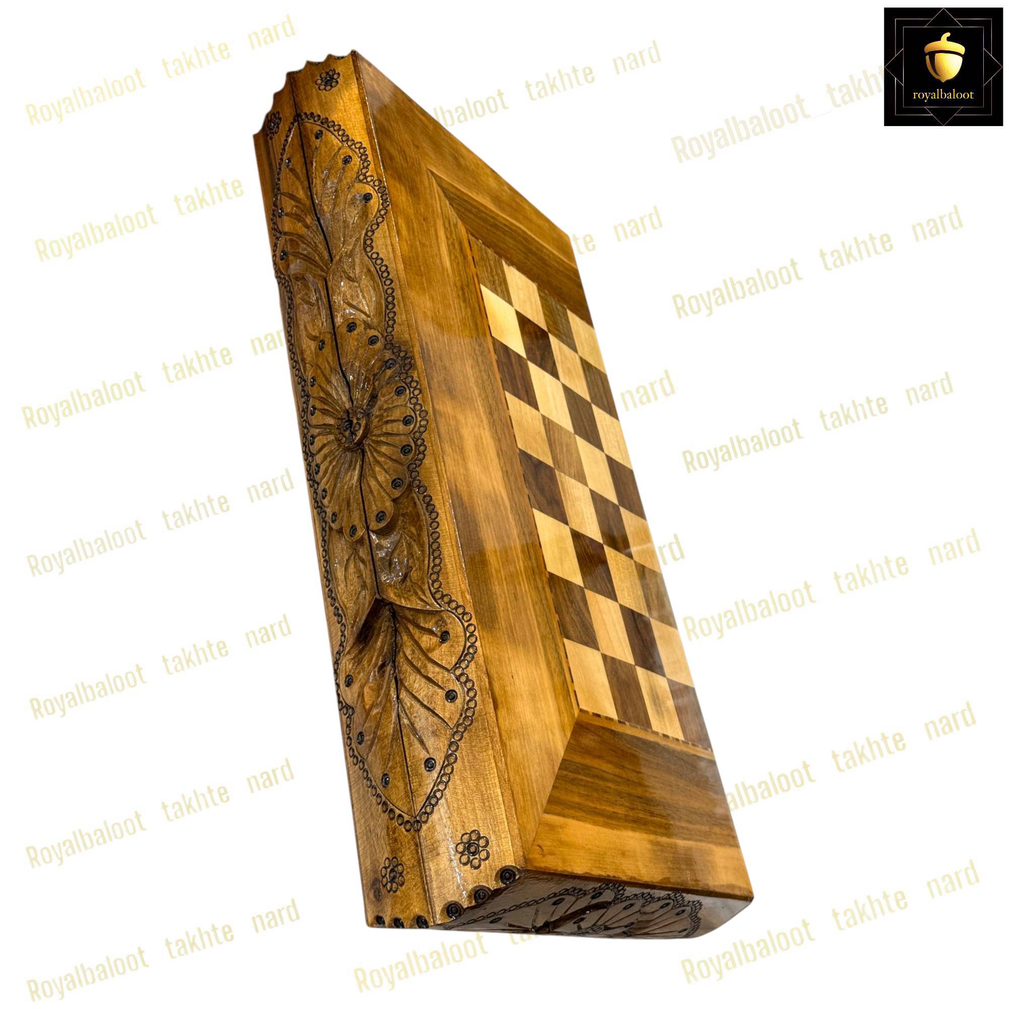تخته نرد از چوب گردو ساخته شده سایز تخته نرد 50*50 استاندارد میباشد دور تخته نرد منبت کار دست میباشد داخل تخته نرد رزین سبز زیبا کار شده در مرکز طرح ستاره معرق شده خانه های شطرنج سایز استاندارد و معرق کاری میباشد مهره تخته نرد چوبی منبت زیر پارچه تاس المانی سنگین وزن دار تاس مالزی چرخش بالا و کاور ترمه از جمله متعلقات تخته نرد میباشد تخته نرد پلی استر دو مواد خورده و کاملا براق میباشد همچنین پلی استر مانند پوششی عایق و لایه محافظتی روی تخته نرد عمل میکند مانع از ایجاد خط و خش و اب و رطوبت به تخته نرد میشود داخل تخته نرد رزین سبز بسیار زیبا کار شده در مرکز تخته نرد طرح ستاره معرق شده سطح تخته نرد به خاطر پلی استر بسیار صاف و صیقلی میباشد که مهره به راحتی میکند و تاس چرخش بالاتری دارد دور تخته نرد کامل منبت عمیق و پرکار میباشد حتی شانه های تخته نرد از چوب گردو ساخته شده دو عدد لولا بسیار قوی مخفی برای تخته نرد طراحی شده