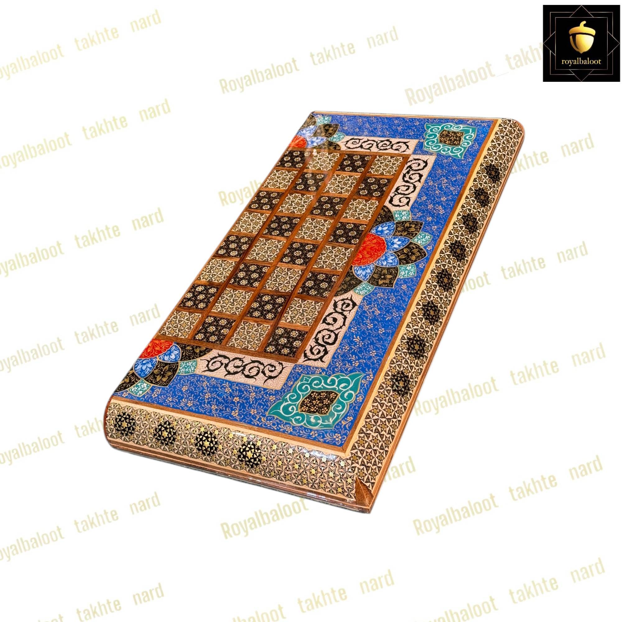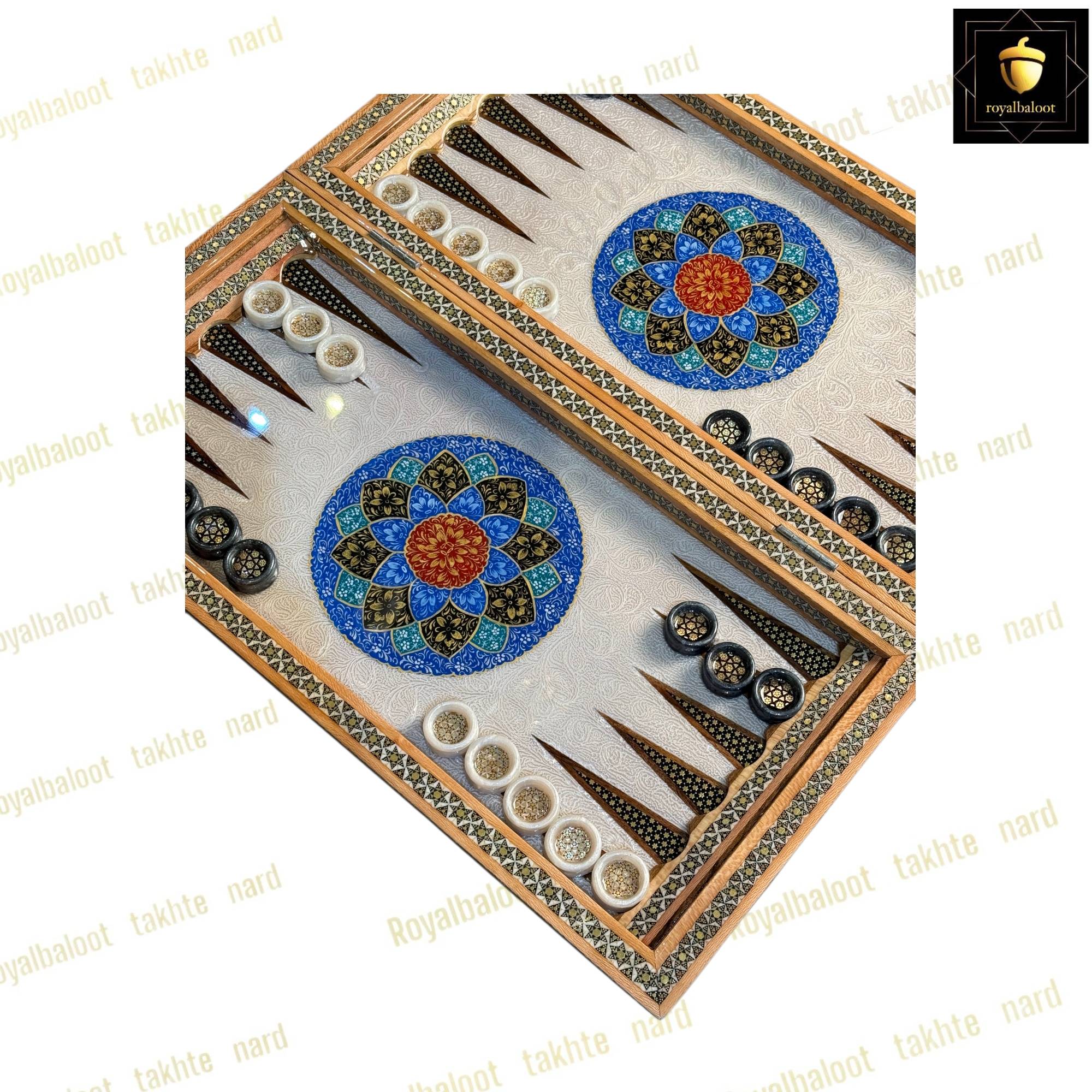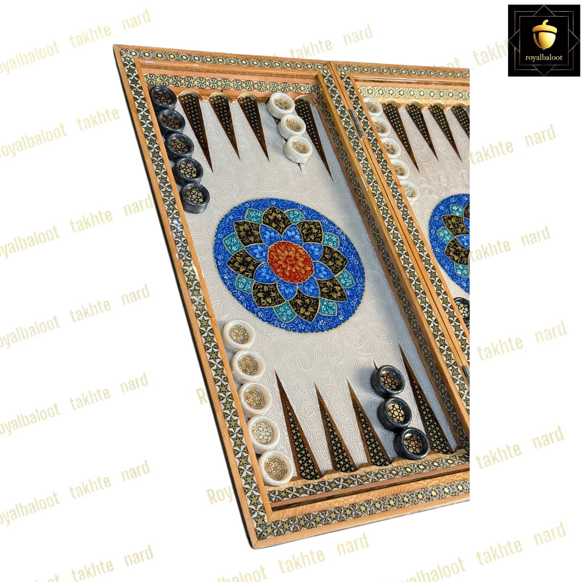 تخته نرد از چوب گردو ساخته شده سایز تخته نرد 50*50 استاندارد میباشد به صورت دو بازی تخته نرد و شطرنج میباشد خانه های شطرنج سایز استاندارد و خاتم کاری میباشد حاشیه شطرنج نقاشی تذهیب بسیار زیبا و اصولی میباشد کلاف داخلی و بیرونی تخته نرد خاتم کاری میباشد دو عدد لولا قوی مخفی برای تخته نرد طراحی شده موجب راحت باز و بسته کردن تخته نرد میشود داخل تخته نرد در مرکز تقاشی بسیار پرکار و ظریف تذهیب میباشد زمینه داخلی تخته نرد روشن میباشد شانه ها و جای مهره تخته نرد خاتم کاری میباشد تخته نرد پلی استر خورده و براق میباشد پلی استر مانند پوششی عایق و لایه محافظتی روی تخته نرد عمل میکند مانع از نفوذ اب رطوبت و خط و خش به تخته نرد میشود مهره تخته نرد خاتم کاری زیر مخمل کیف مهره تخته نرد تاس مالزی چرخش بالا مختص تخته نرد های خاتم سامسونت چرم رمزدار دسته متحرک داخل مخمل از جمله متعلقات تخته نرد میباشد تخته نرد های خاتم تولید مجموعه رویال بلوط به صورت تضمینی میباشد و از بهترین متریال ساخته شده تخته نرد های خاتم به علت خاتم کاری هنر اصیل ایرانی و نقاشی کار دست ارزش بسیار بالایی دارد و جز کالا های لوکس نفیس و صادراتی محسوب میشود