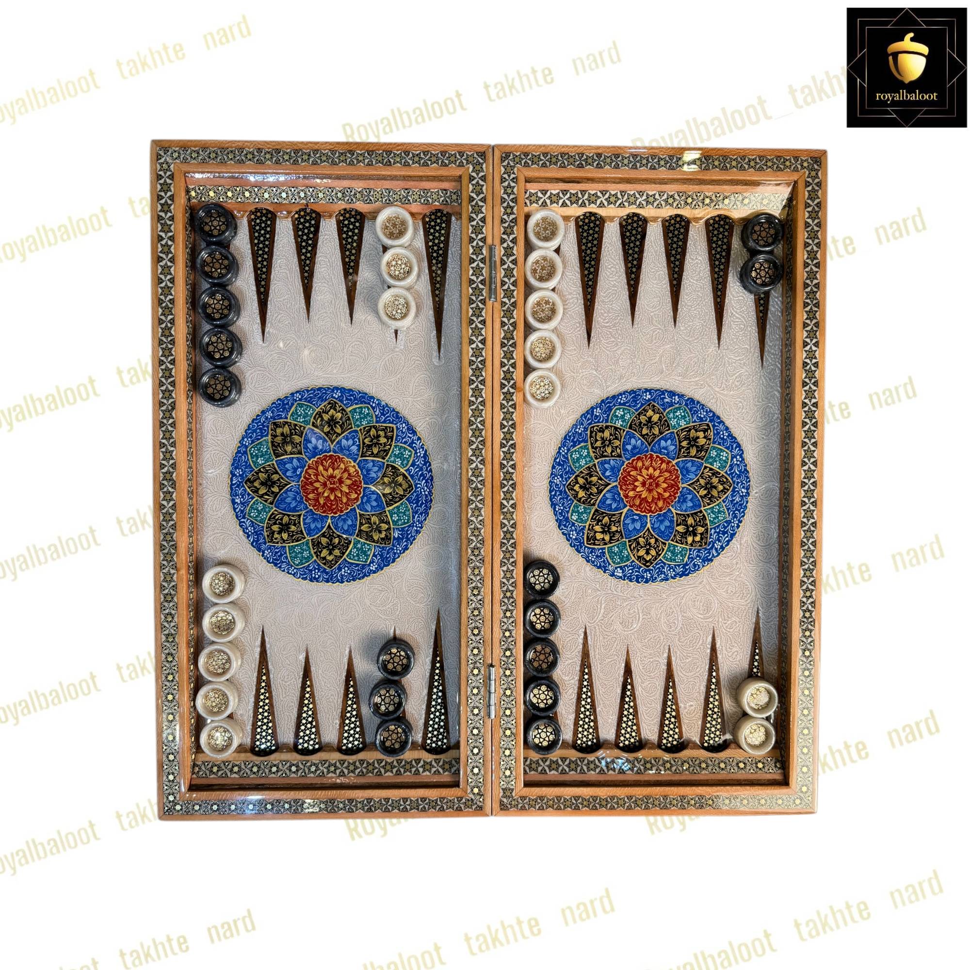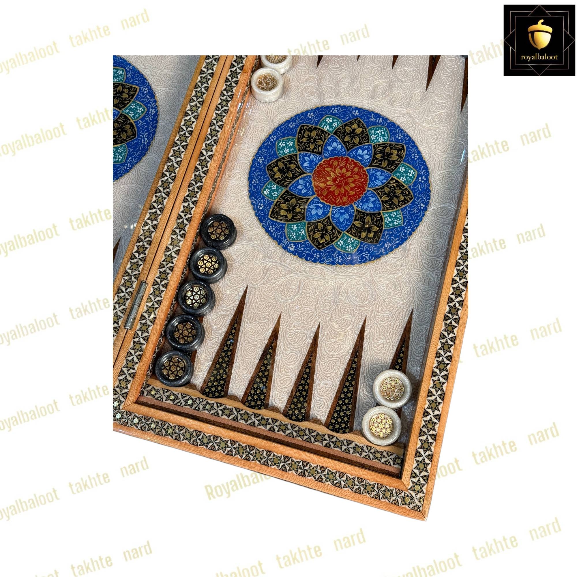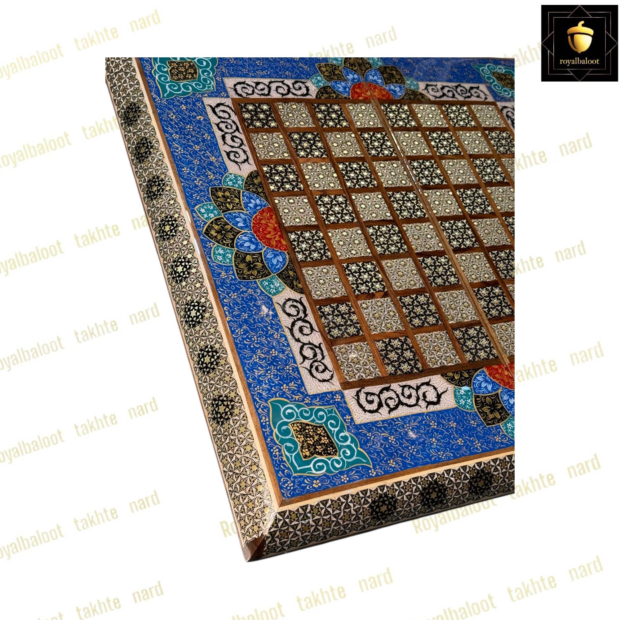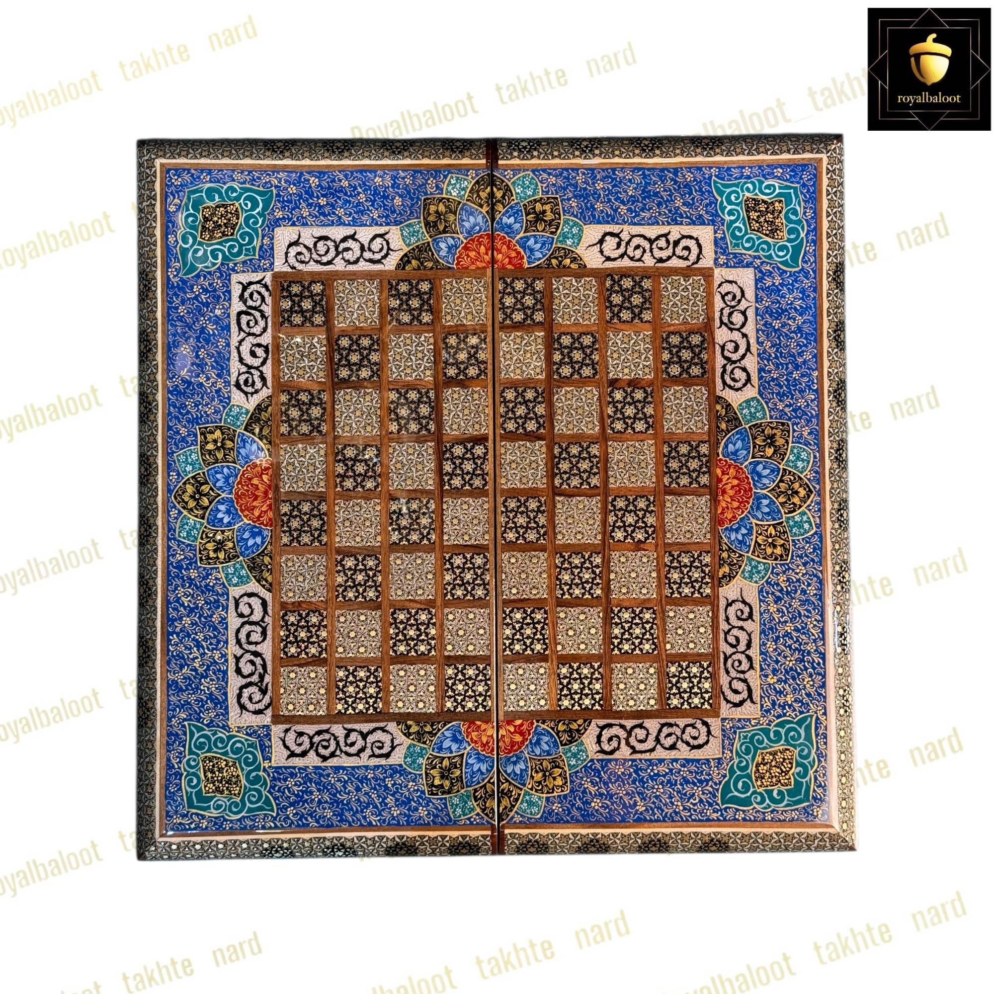 تخته نرد از چوب گردو ساخته شده سایز تخته نرد 50*50 استاندارد میباشد به صورت دو بازی تخته نرد و شطرنج میباشد خانه های شطرنج سایز استاندارد و خاتم کاری میباشد حاشیه شطرنج نقاشی تذهیب بسیار زیبا و اصولی میباشد کلاف داخلی و بیرونی تخته نرد خاتم کاری میباشد دو عدد لولا قوی مخفی برای تخته نرد طراحی شده موجب راحت باز و بسته کردن تخته نرد میشود داخل تخته نرد در مرکز تقاشی بسیار پرکار و ظریف تذهیب میباشد زمینه داخلی تخته نرد روشن میباشد شانه ها و جای مهره تخته نرد خاتم کاری میباشد تخته نرد پلی استر خورده و براق میباشد پلی استر مانند پوششی عایق و لایه محافظتی روی تخته نرد عمل میکند مانع از نفوذ اب رطوبت و خط و خش به تخته نرد میشود مهره تخته نرد خاتم کاری زیر مخمل کیف مهره تخته نرد تاس مالزی چرخش بالا مختص تخته نرد های خاتم سامسونت چرم رمزدار دسته متحرک داخل مخمل از جمله متعلقات تخته نرد میباشد تخته نرد های خاتم تولید مجموعه رویال بلوط به صورت تضمینی میباشد و از بهترین متریال ساخته شده تخته نرد های خاتم به علت خاتم کاری هنر اصیل ایرانی و نقاشی کار دست ارزش بسیار بالایی دارد و جز کالا های لوکس نفیس و صادراتی محسوب میشود