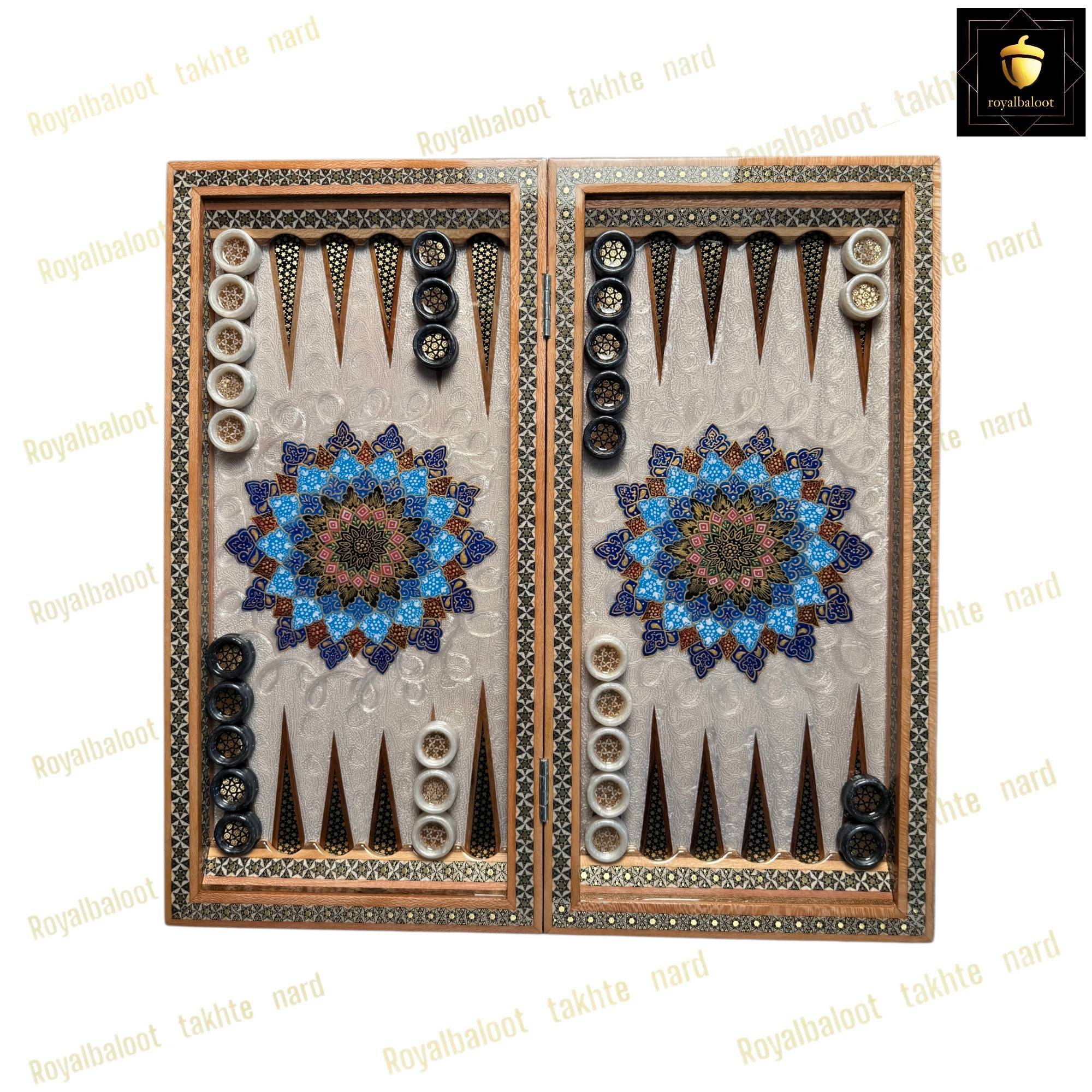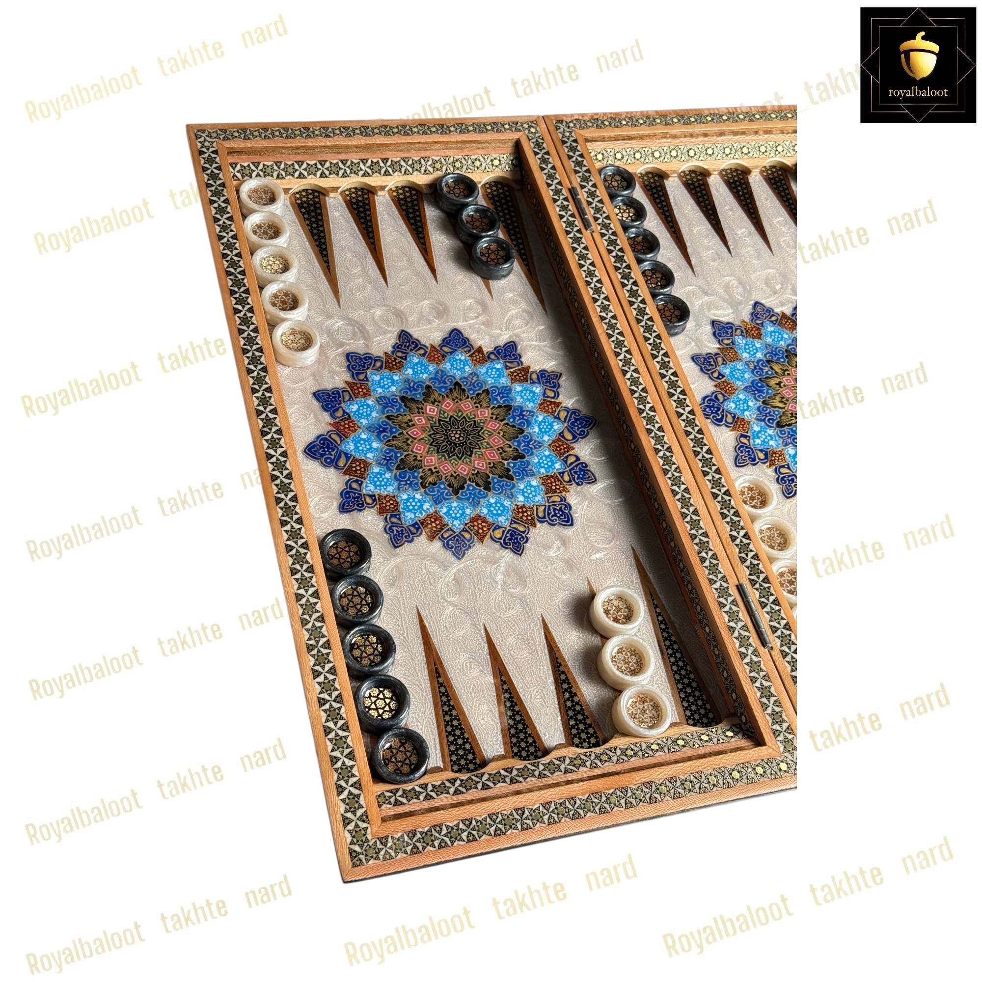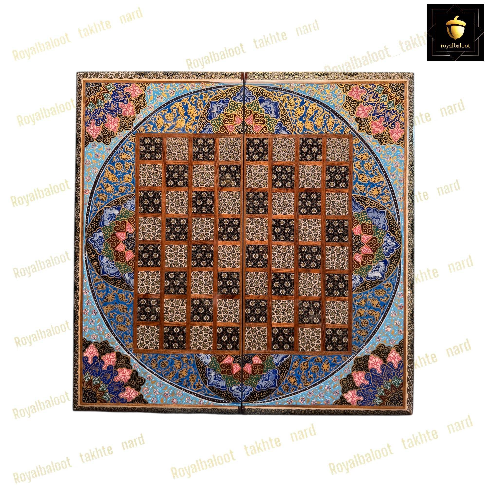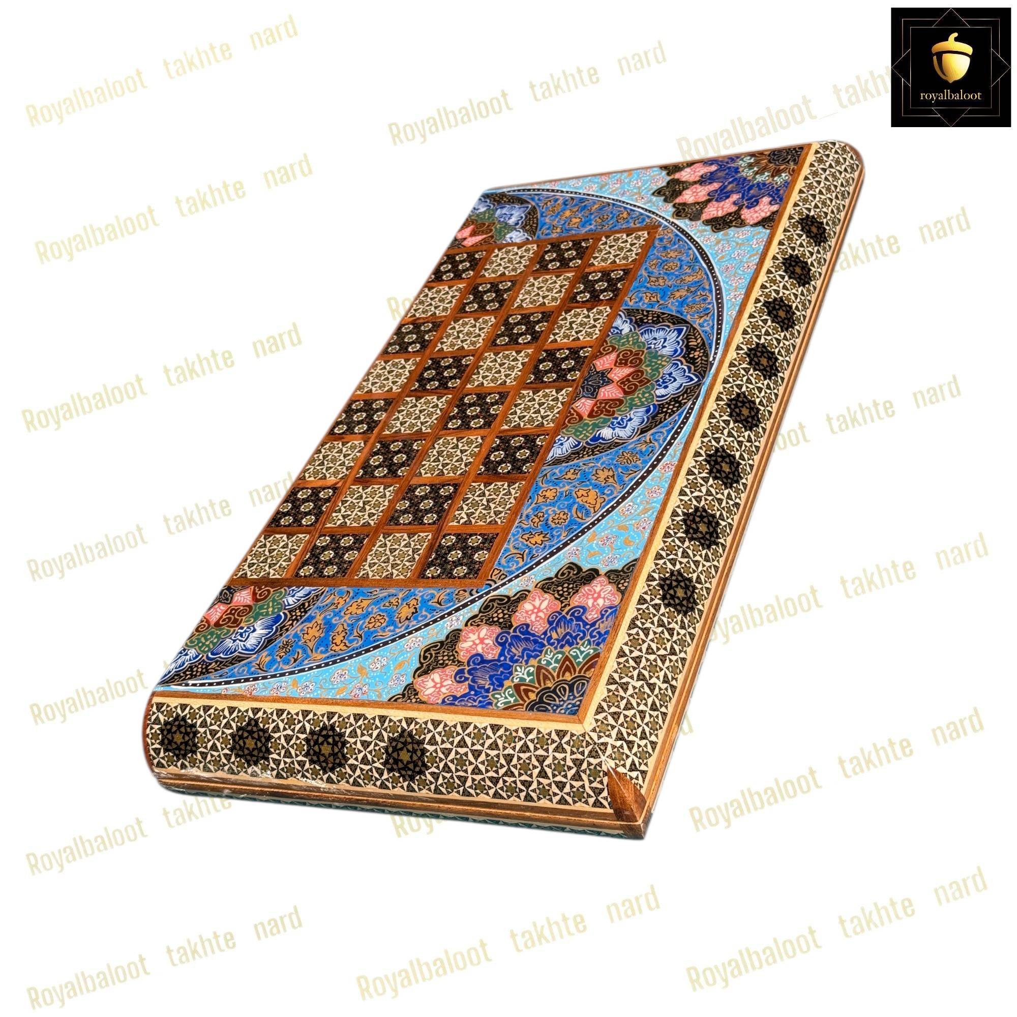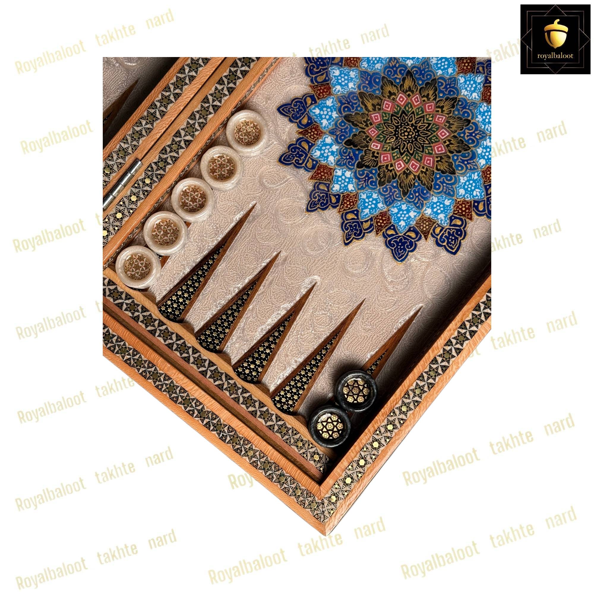 تخته نرد از چوب گردو ساخته شده سایز تخته نرد 50*50 استاندارد میباشد به صورت دو بازی تخته نرد و شطرنج میباشد خانه های شطرنج خاتم کاری و سایز استاندارد میباشد حاشیه شطرنج نقاشی تذهیب میباشد داخل تخته نرد زمینه روشن میباشد در مرکز تخته نرد نقاشی تذهیب میباشد کلاف داخلی و بیرونی تخته نرد خاتم کاری میباشد شانه های تخته نرد خاتم کاری میباشد در نقاشی تخته نرد از رنگ های زیبا و سنتی و اصیل ایرانی استفاده شده تخته نرد پلی استر خورده و براق میباشد پلی استر مانند پوششی عایق و لایه محافظتی روی تخته نرد عمل میکند مانع از نفوذ اب رطوبت و خط و خش به تخته نرد میشود تخته نرد دارای دو عدد لولا قوی و مخفی میباشد موجب راحت باز و بسته کردن تخته نرد میشود مهره تخته نرد خاتم کاری زیر مخمل تاس مالزی چرخش بالا کیف مهره تخته نرد سامسونت چرم رمزدار داخل مخمل دسته متحرک از جمله متعلقات تخته نرد میباشد تخته نرد های خاتم نقاشی تولید مجموعه رویال بلوط به صورت تضمینی میباشد و از بهترین متریال ساخته شده تخته نرد های خاتم به علت هنر اصیل ایرانی خاتم کاری و نقاشی کار دست جز کالاهای نفیس و صادراتی محسوب میشود و ارزش بسیار بالایی دارد و بهترین سوغات برای خارج از کشور محسوب میشود