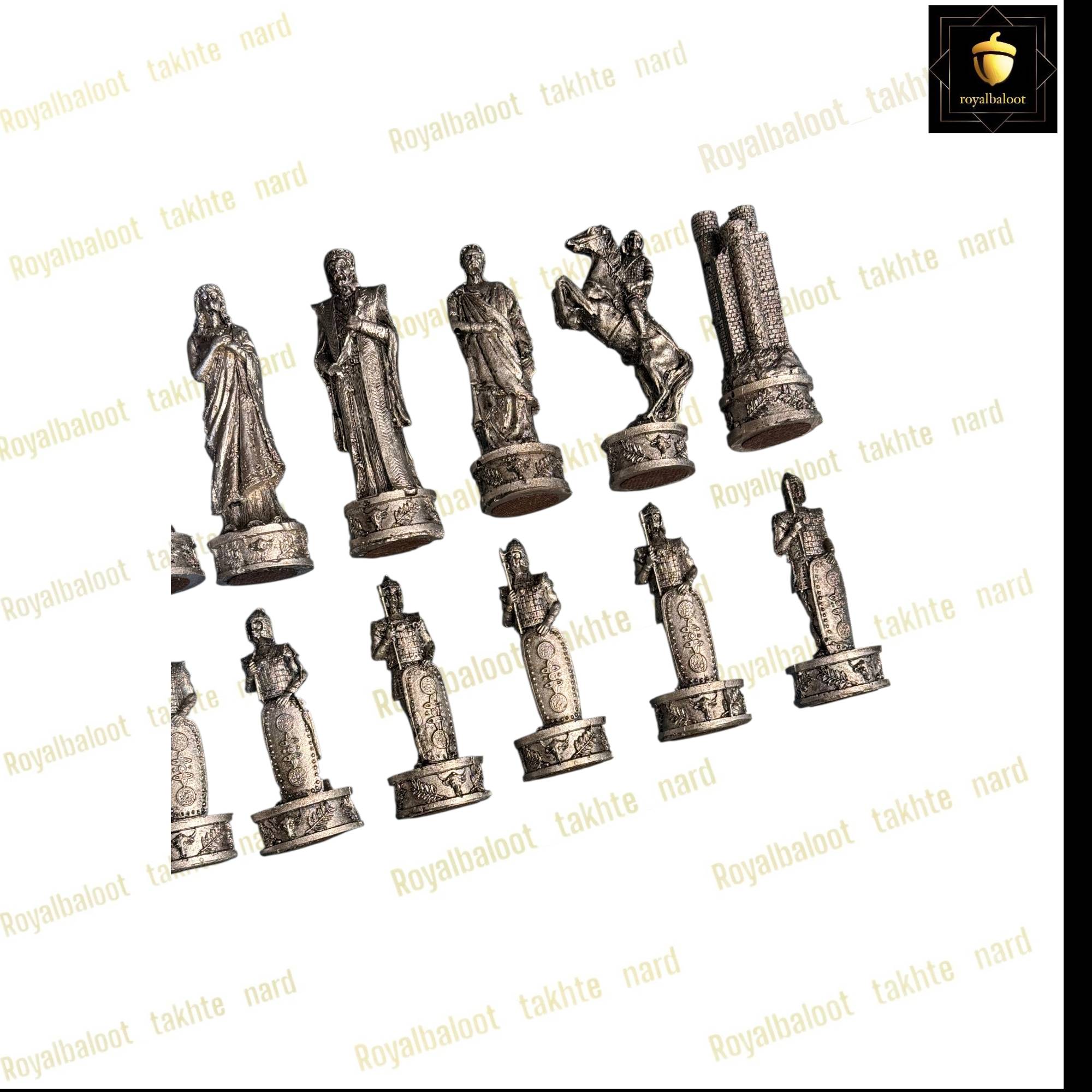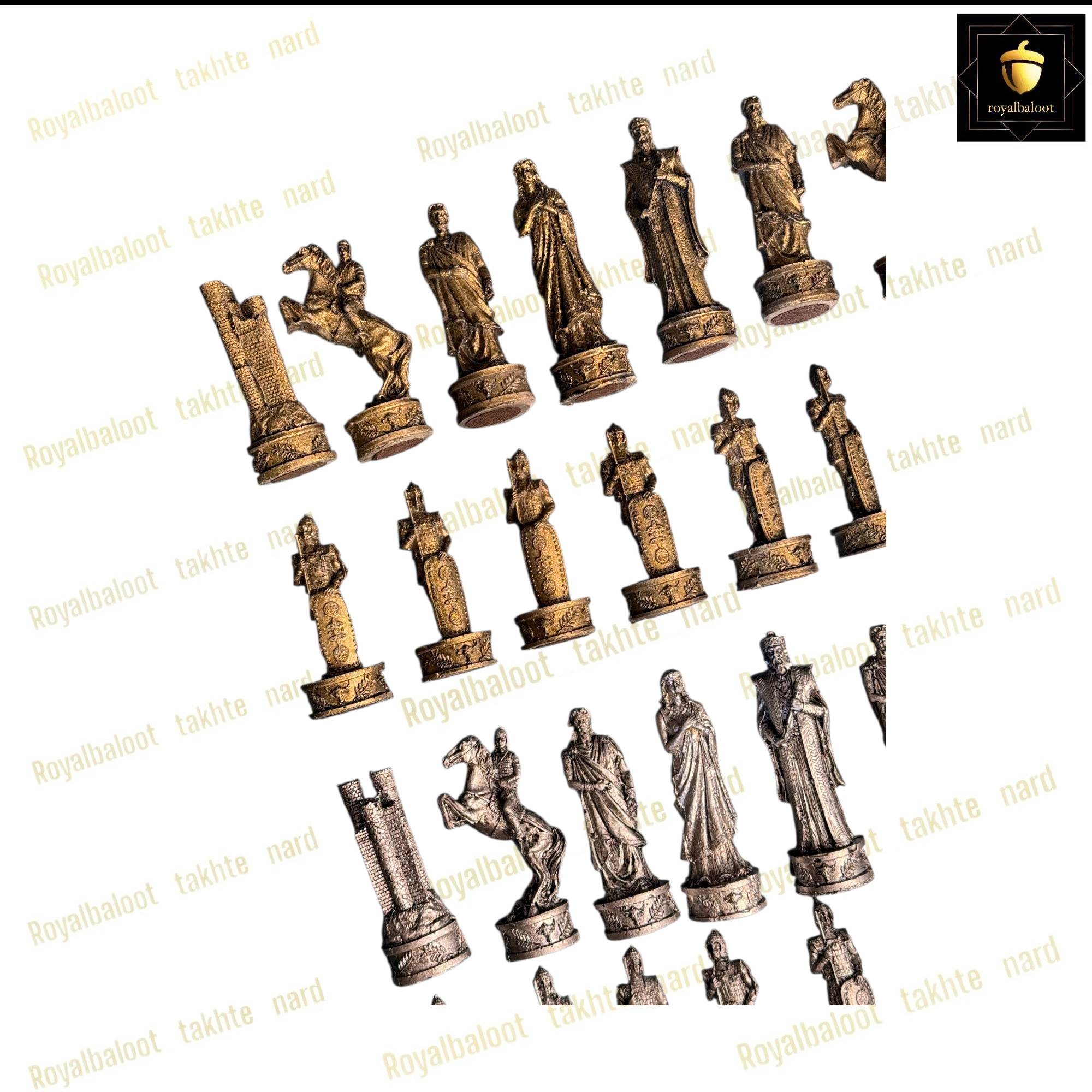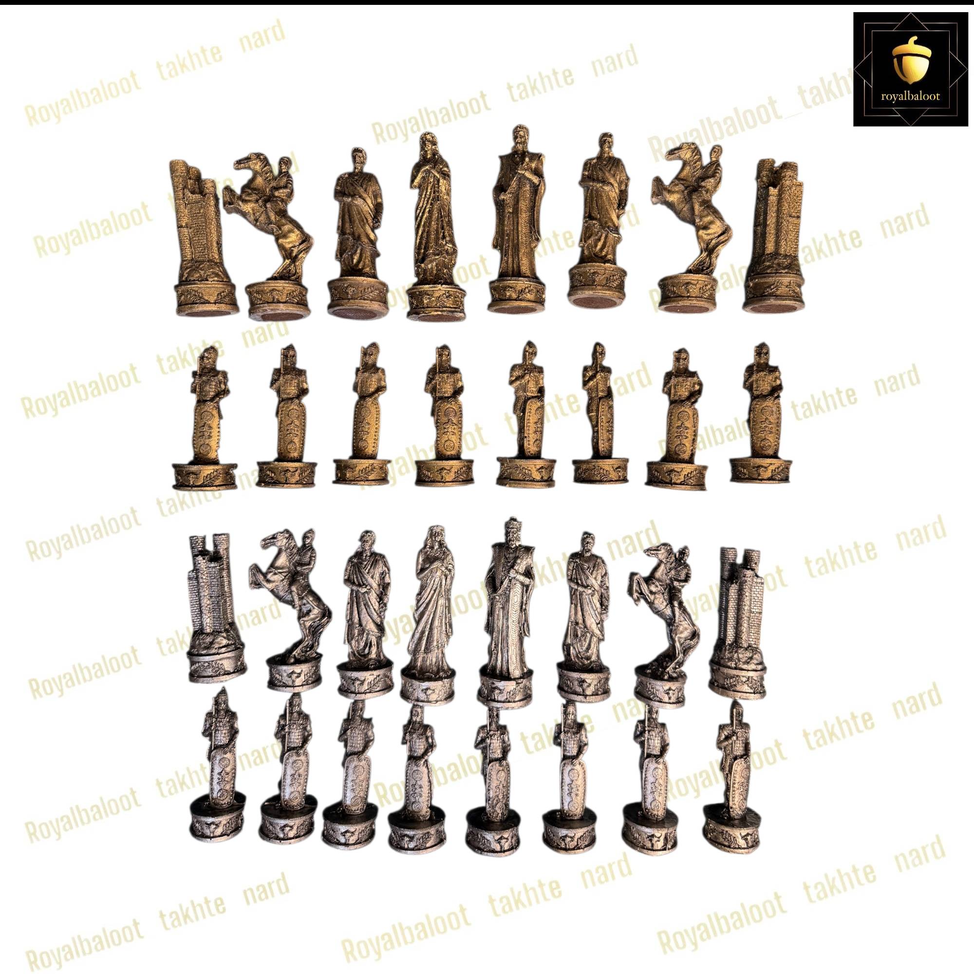 مهره شطرنج ها از جنس پلی استر میباشد زیر مهره ها نمد کار شده در دو رنگ طلایی و نقره ای میباشد به صورت ادمکی میباشد سلسله اشکانیان میباشند سایز استاندارد میباشد سایز مهره شاه 11/50سانت سایز مهره وزیر 11 سانت سایز مهره فیل 10 سانت سایز مهره اسب 10 سانت سایز مهره قلیه یا رخ 9 سانت و سایز مهره سرباز 9 سانت میباشد مهره ها علاوه بر جنبه بازی و سرگرمی جنبه دکوری هم دارنند دارای جعبه و پارتیشن بندی مخمصوص میباشد