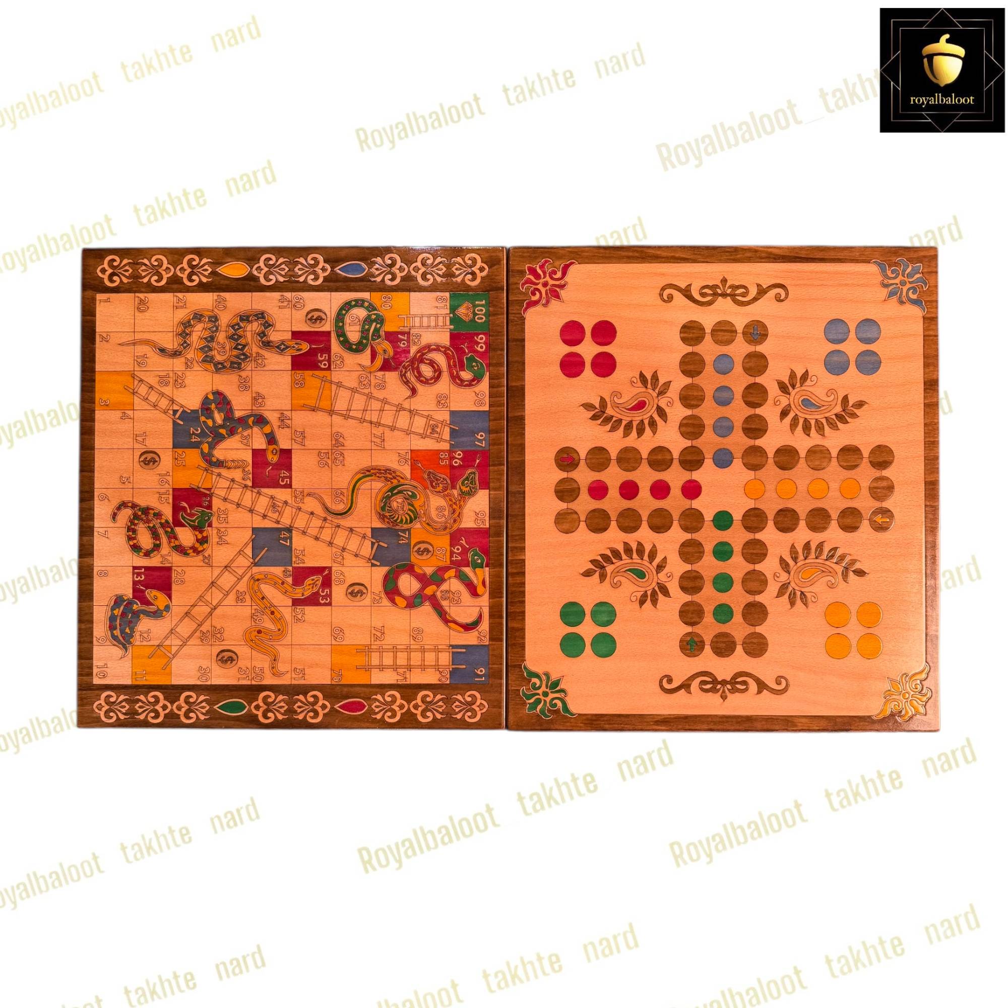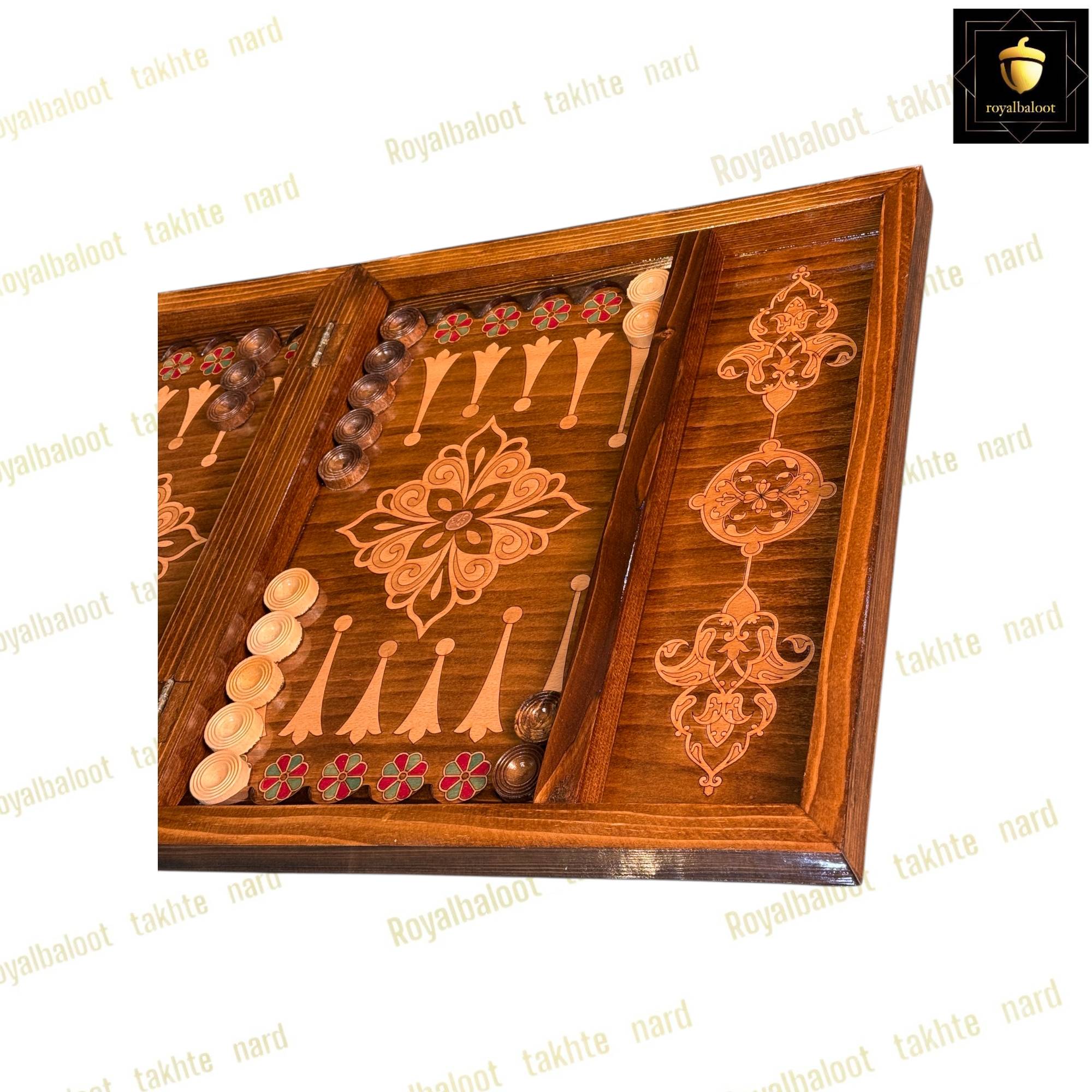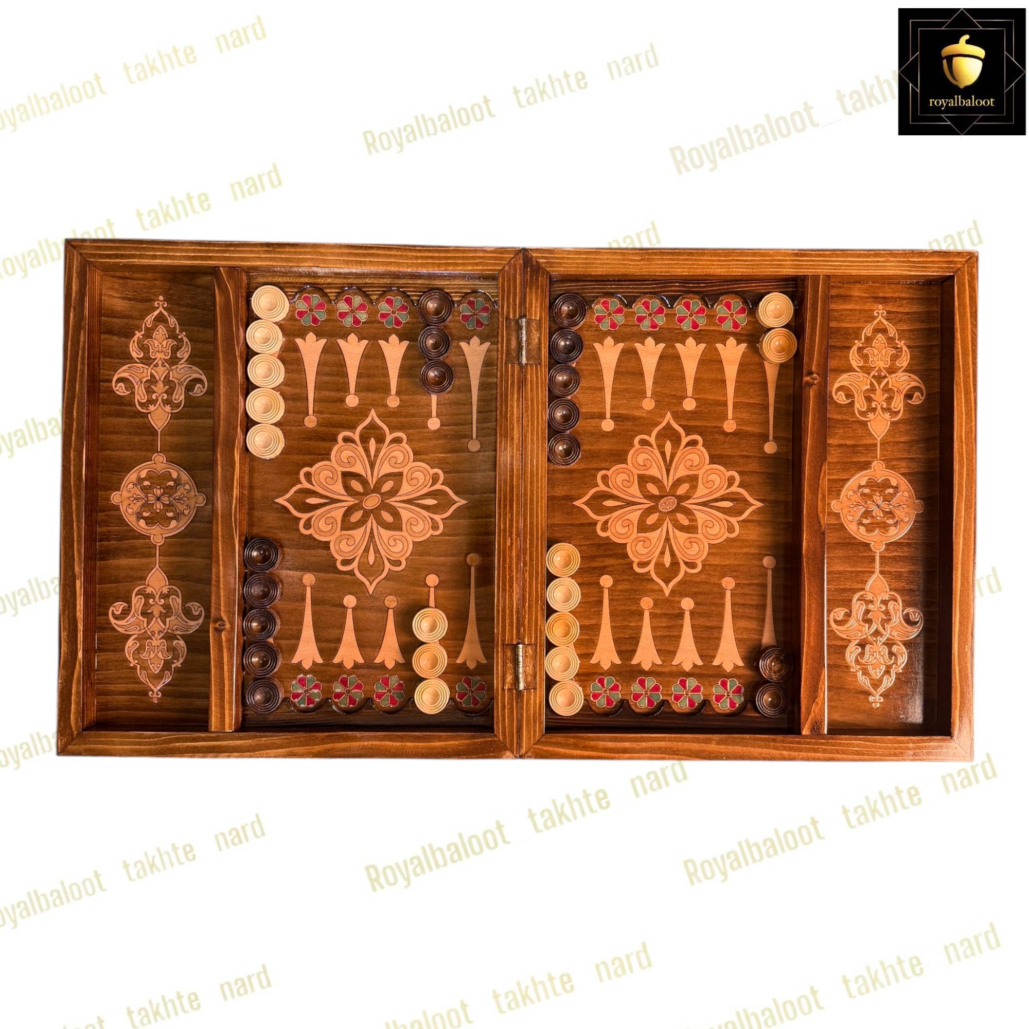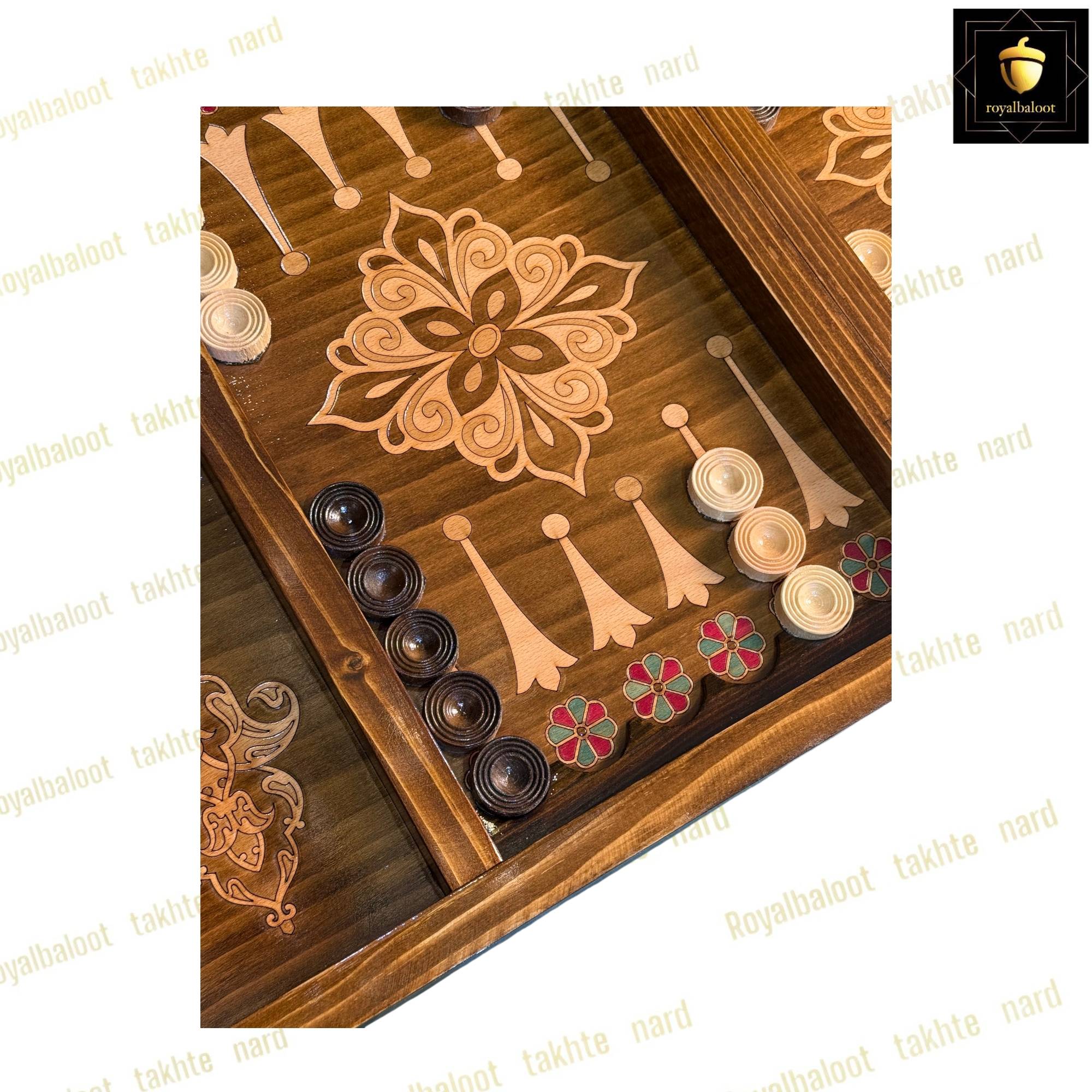 سه بازی از چوب راش ساخته شده سایز در حالت بسته 45*39 میباشد و در حالت باز 78*45 میباشد طرح ها همه معرق کار دست میباشد با دست رنگ امیزی شده شامل سه بازی تخته نرد منچ و مارپله میباشد داخل تخته نرد در مرکز طرح های سنتی و اسلیمی معرق شده همراه مهره تخته نرد چوب گردو سایز بزرگ و استاندارد زیر پارچه تاس مالزی چرخش بالا برای تخته نرد و مهره منچ و مارپله چوبی و پلاستی و تاس های کریستالی برای منچ و مارپله میباشد سه بازی پلی استر خورده و کاملا براق میباشد پلی استر مانند پوششی عایق و لایه محافظتی روی تخته نرد عمل میکند مانع از نفوذ اب رطوبت و خط و خش به تخته نرد میشود بدون اقرار میتوان گفت بترین سه بازی موجود در ایران میباشد کیفیتی در حد صادرات دارد و سایز بزرگی دارد سه بازی های چوبی معرق تولید مجموعه رویال بلوط به صورت تضمینی میباشد و ارزش بسیار بالایی دارد