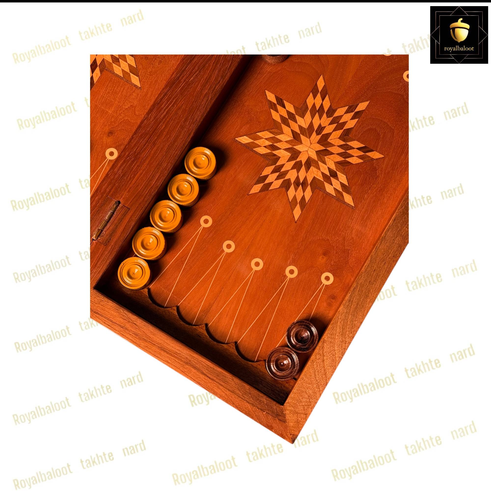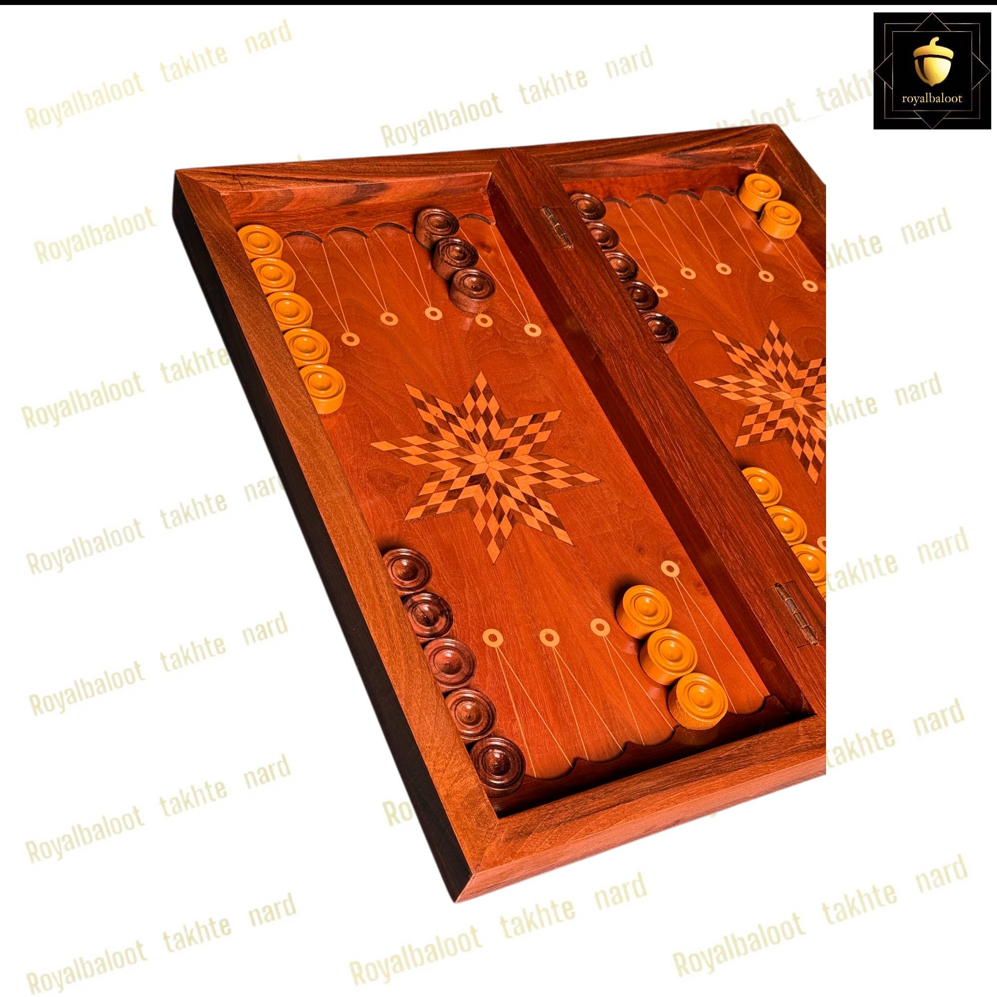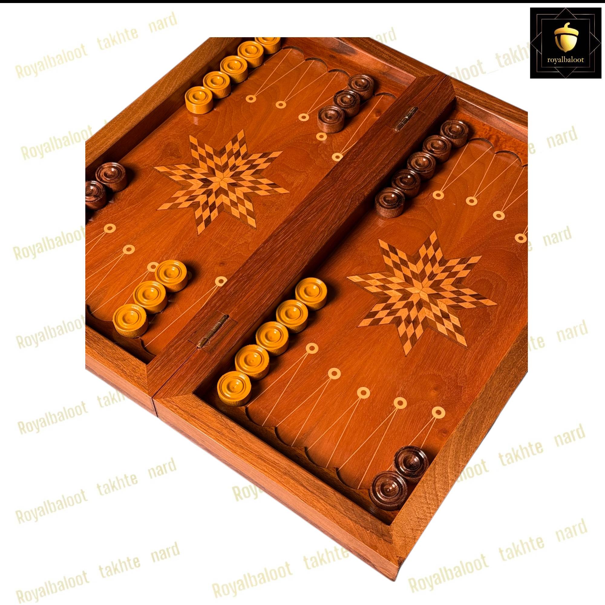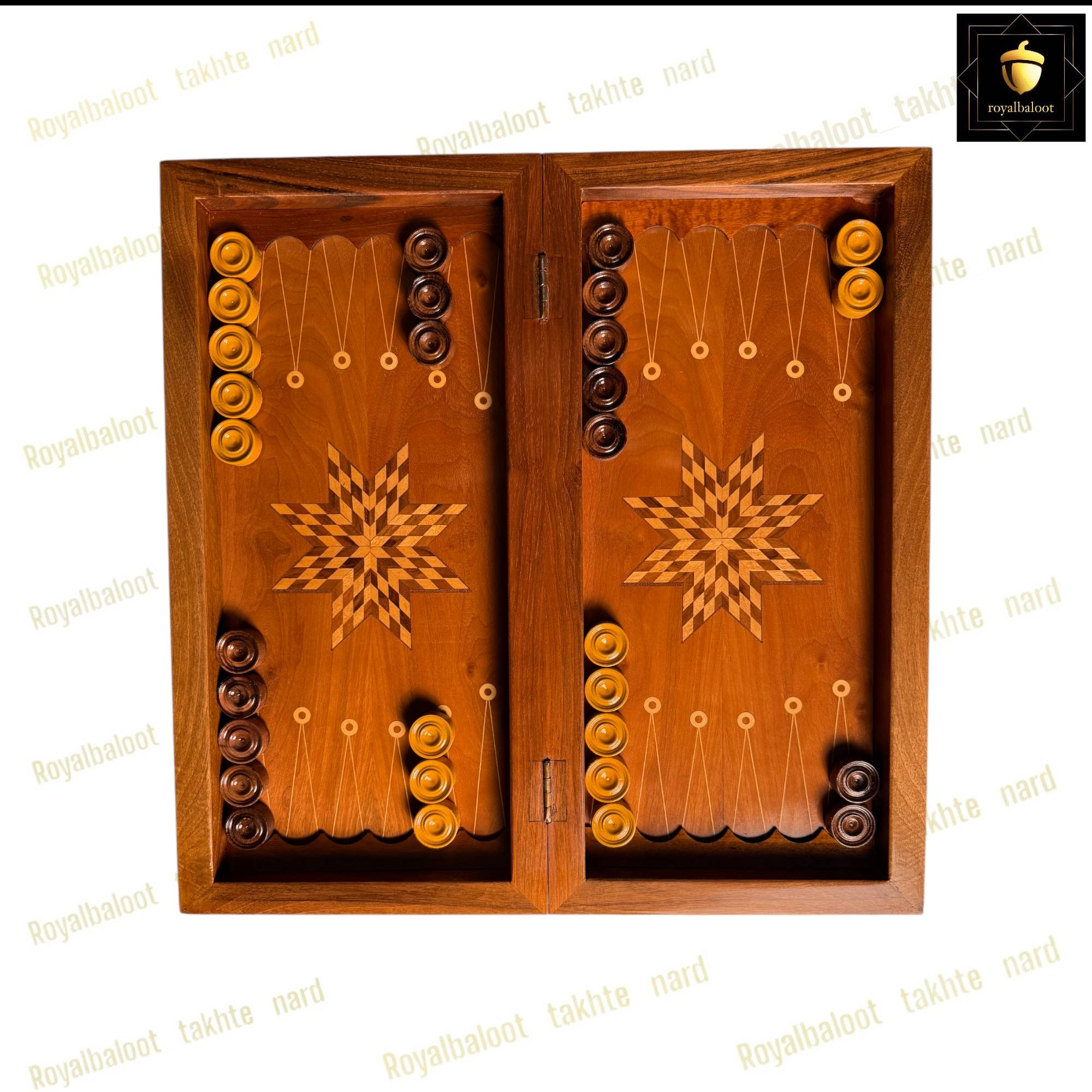 تخته نرد از چوب گردو ساخته شده سایز تخته نرد 50*50 استاندارد میباشد به صورت دو بازی تخته نرد و شطرنج میباشد خانه های شطرنج سایز استاندارد و معرق کاری میباشد حاشیه شطرنج منبت کار دست با عمق بالا و بسیار ظریف و پرکار میباشد داخل تخته نرد در مرکز ستاره هشت پر معرق میباشد شانه های تخته نرد از چوب گردو ساخته شده دو عدد لولا قوی و مخفی برای تخته نرد طراحی شده موجب راحت باز و بسته کردن تخته نرد میشود تخته نرد پلی استر خورده و کاملا براق میباشد پلی استر پوششی عایق و لایه محافظتی روی تخته نرد میباشد مانع از نفوذ اب رطوبت و خط و خش روی تخته نرد میشود تخته نرد همراه مهره تخته نرد چوب گردو زیر پارچه تاس المانی سنگین وزن دار تاس مالزی چرخش بالا و کاور ترمه میباشد بهترین چوب برای ساخت تخته نرد چوب گردو کردستان میباشد ارزش و دوام بالایی دارد بهترین تخته نرد برای تخته نرد بازان و افراد حرفه ای میباشد