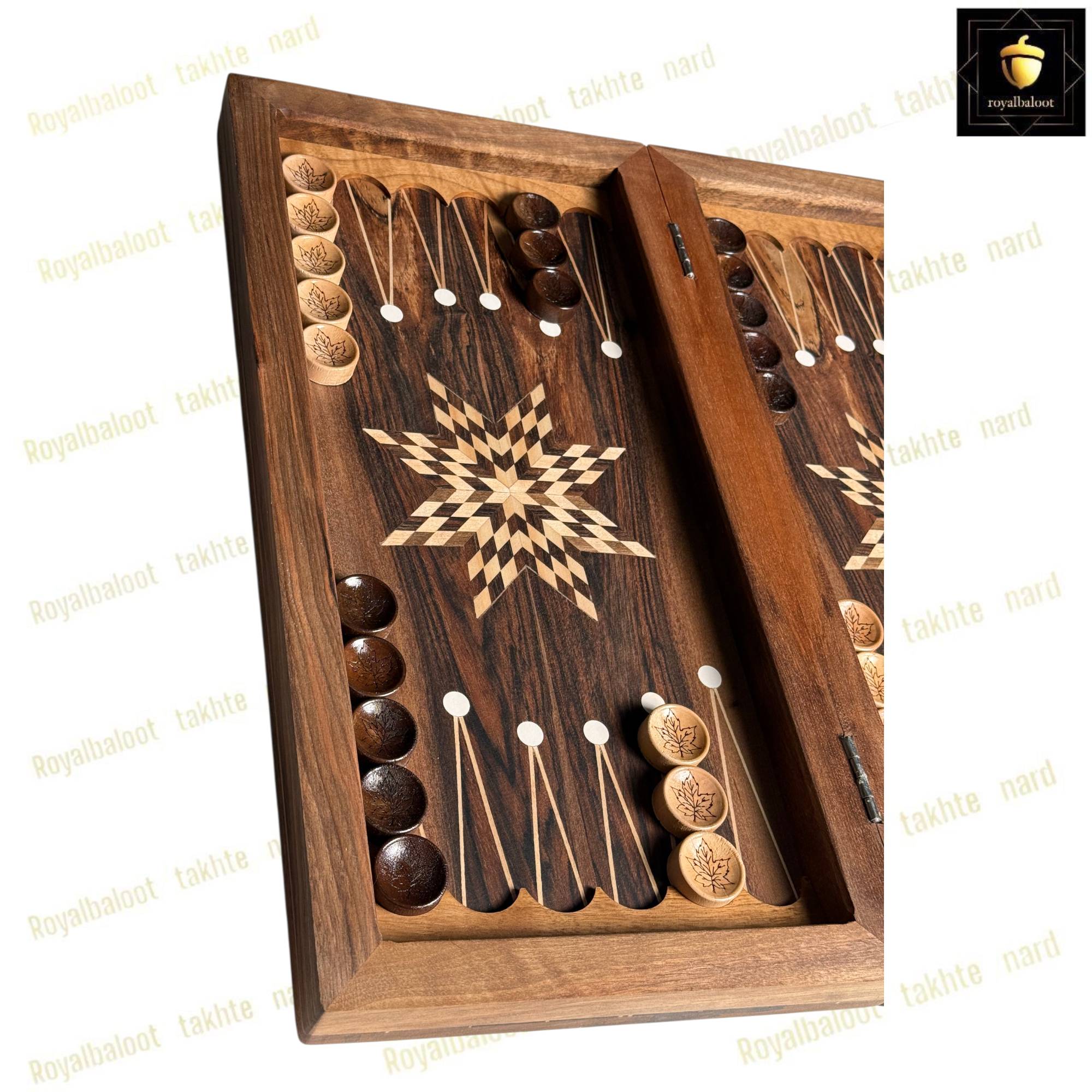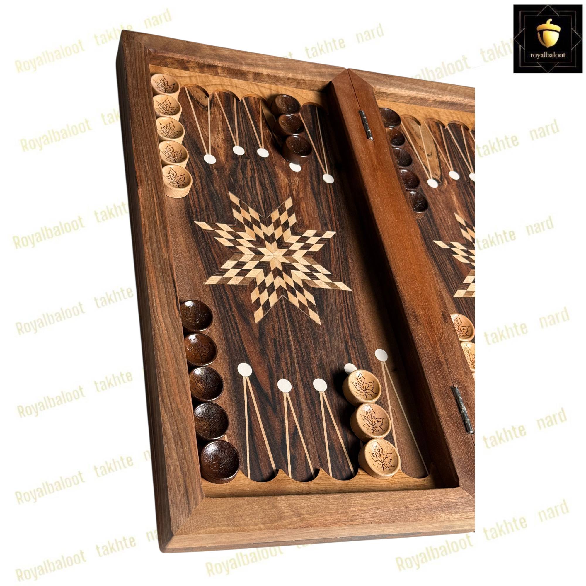 تخته نرد از چوب گردو ساخته شده سایز تخته نرد 50*50 استاندارد میباشد مهره تخته نرد چوب گردو زیر پارچه تاس المانی سنگین وزن دار تاس مالزی چرخش بالا و کاور ترمه از جمله متعلقات تخته نرد میباشد